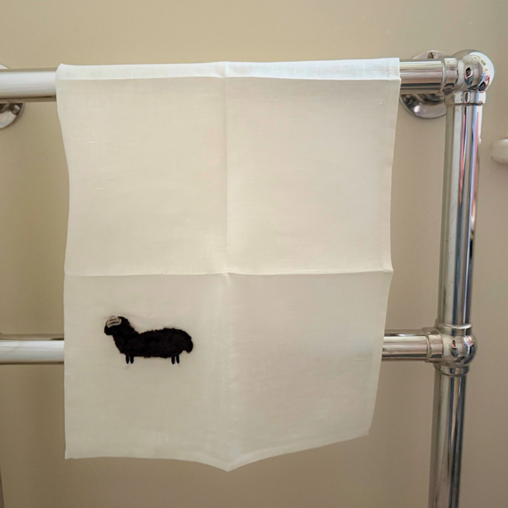 White pure french linen detail hand towel with chocolate embroidered wool sheep.