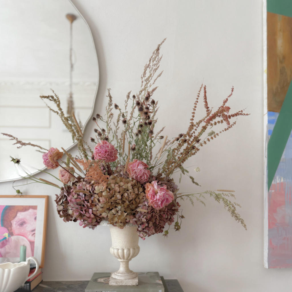 This beautiful antique metal urn is so versatile. We have used it also to put our kitchen utensils in. We do love it with Melissa's collection of uniquely designed dry flowers, Flowers are included.